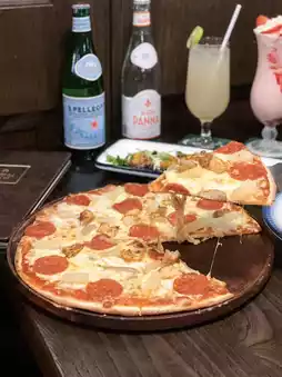 You can choose between thick or thin crust for the pizza. This time, the thin crust was chosen, which I personally find to have a moderate thickness. The base has a slightly chewy texture, topped with chicken, pork sausage, spicy sausage, and pineapple.