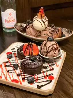 The chocolate lava cake is served with chocolate ice cream. Unlike most restaurants that serve only one piece, this place offers two, making it very filling. However, the lava cake lacks crispiness and is relatively moist.