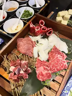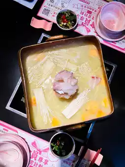 A limited-time soup base🍲 featuring a creamy white broth with enoki mushrooms, whole papaya, and grouper fillets. Once boiled, the staff will cut the papaya into chunks🍈. Start with a bowl of hot soup🥣—the thickly sliced grouper fillets are tender and infused with the broth's rich, sweet flavor🐠👍🏻.