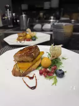 The pan-fried foie gras with caramel apples is as tender and smooth as tofu, and the sweet dragon fruit and blueberries provide a refreshing break.
