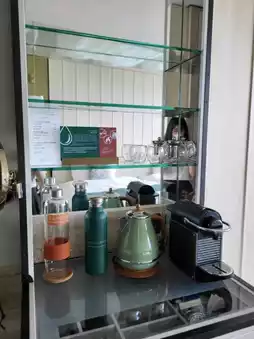 The room had glass water bottles, and water was replenished for free without limits (՞⸝⸝• ̫ •⸝⸝՞)💕. There were also coasters made of coral, showcasing the hotel’s commitment to SDGs.