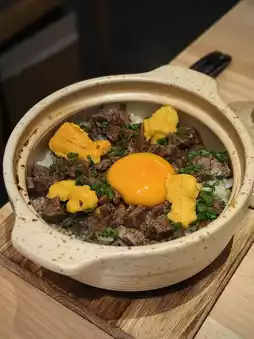 ❥Their pot-stirred rice here is very famous, the ingredients are not stingy at all, a lot of wagyu beef and four large pieces of fresh and sweet seaweed😍 There are rice crumbs at the bottom of the pot.