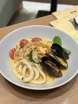 The tom yum has a prominent flavour, sour and spicy and quite appetizing. The seafood is mussels, squid and prawns. The pasta is quite juicy, with a feeling of getting spicier the more you eat