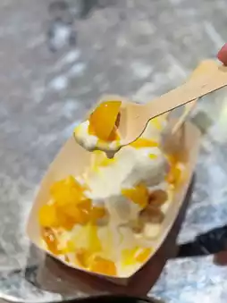 A layered mix of white and yellow, this dessert also uses yogurt ice cream as the base, drizzled with naturally fragrant wild honey that is sweet but not overwhelming. It is paired with fresh, juicy mango chunks, chewy plain mochi, and two crispy almond flakes that offer a rich almond aroma.