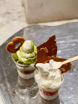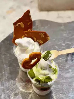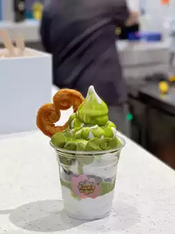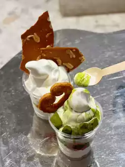 A delightful combination of white and green, this matcha Greek yogurt ice cream is dense yet light, without the stickiness of regular ice cream. It has a subtle tangy yogurt flavor, topped with rich matcha milk sauce that exudes a deep tea aroma. The large, juicy blueberries are sweet and tangy, the matcha mochi is chewy, and the crispy butterfly pastry adds a buttery fragrance.