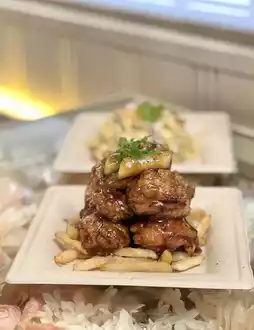 The fried chicken has a thin batter, making it crispy without being overly thick. The meat is tender and juicy. The garlic flavor isn't too strong, while the sauce is a balanced mix of salty and sweet. Fries are served underneath, and they are fried to a crispy perfection.
