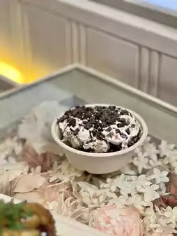 This tiramisu has a lot of cream, topped with crunchy chocolate bits. Beneath the cream, there are red beans 🫘 and ladyfingers, giving it a unique taste compared to regular tiramisu. It has a stronger red bean flavor.