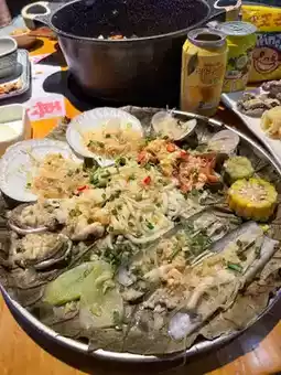 After eating the chicken pot, you can start eating steamed seafood! A large plate of steamed seafood🤩 with crayfish, scallops, sand white, bacon, lobster, mussels, shrimp, asparagus, corn and Sanuki udon, full of sincerity😍 Seasoned with garlic, onion, chili, and fresh ingredients, especially crayfish and scallops are bouncy and sweet, garlic shrimp is very good🥰 The udon absorbs seafood freshness, very tasty😋