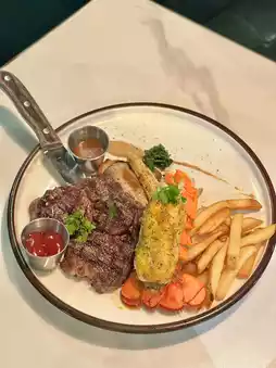 🎀 Charcoal-grilled Australian ribeye steak with lobster tail 🥩🦞 Charcoal grilling is truly a premium steak cooking method, crispy on the outside and tender on the inside, with a world-class charcoal flavor! The lobster was incredibly refreshing, and the vanilla flavor complemented it perfectly. Every vegetable on the plate was delicious, especially the king oyster mushrooms. Even the fries were tasty! How did they do that? 🤤