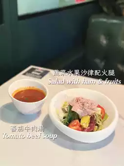 🎀 Tomato Beef Soup + Vegetable Salad - The beef broth was rich and rich. ✨ The fruit in the salad was also fresh and delicious, especially the pineapple! 🍍