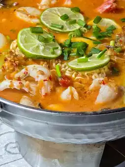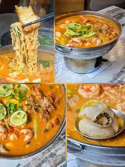 The soup base comes with two options, and we chose the classic Thai Suki flavor. The sweet, sour, and spicy taste blends perfectly, making it incredibly appetizing. The seafood includes shrimp, baby squid, and fish fillets, along with Thai-style roasted pork belly. The ingredients are rich, and the Mama noodles absorb all the flavors from the soup and ingredients, delivering an authentic Thai taste.