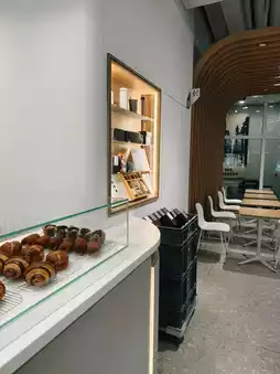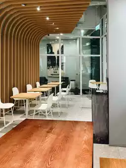 ✨ A minimalist cafe with a cool, clean style, contrasting with wood and exposed concrete. The airy atmosphere is perfect for a break or a cup of your favorite coffee.