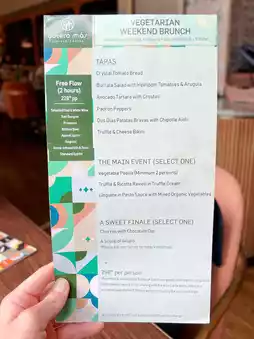 On weekends, the restaurant offers a variety of brunch options, including appetizers, main courses, and desserts, with vegetarian menus available.