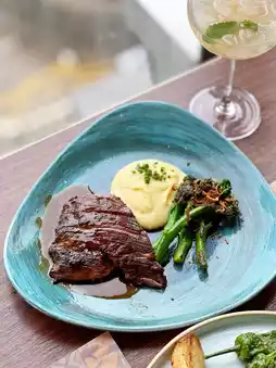 Dry-aged Wagyu bavette with intensified flavor, seared to perfection with a pink center. The meat is tender and juicy, paired with creamy mashed potatoes and roasted broccoli.
