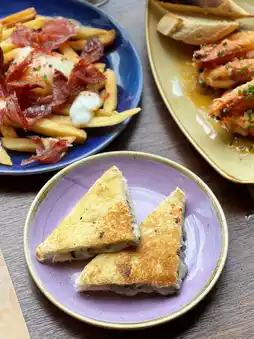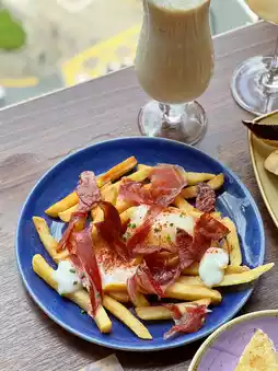 Runny eggs with rich yolk sauce, accompanied by slices of Spanish ham and chorizo, offering a nutty aroma and a balance of salty and sweet flavors. Crispy golden fries soak up all the goodness.