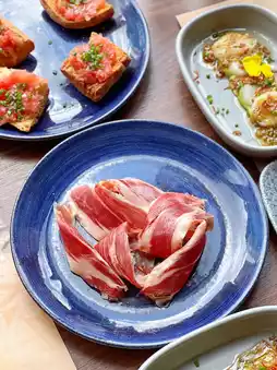 Thinly sliced Spanish ham with a perfect balance of lean and fat, offering a firm texture and savory flavor, complemented by a subtle hint of oil aroma.
