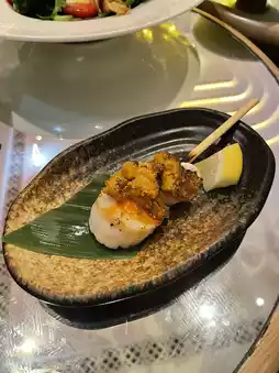 The scallops are smooth and fresh, and the grilled seaweed has a burnt flavor.