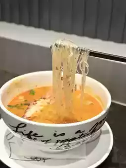 Next, the Thai-style giant prawn tom yum soup with glass noodles had a rich and flavorful broth, perfectly balancing sour and spicy notes to whet the appetite. The dish came with a plump giant prawn, which was quite tender. The glass noodles absorbed all the soup's essence, making it incredibly tasty!