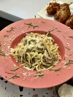 Ordered a 12-inch Margarita pizza. There are five BBQ chicken wings, sweet and spicy like Korean sauce, slightly salty. Truffle Cream Linguine is the highlight, the pasta is bouncy, the cream sauce is rich, mushrooms and shredded cheese are a plus, and although the truffle flavor is not too strong, the overall flavor is unstoppable!