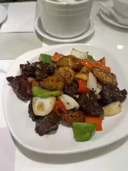 The beef tenderloin was incredibly well presented. The meat was tender and juicy, and the sweet black pepper and honey sauce complemented the crispy pan-fried potatoes, creating a crispy exterior and tender interior. The potatoes were tender and smooth, while the beef tenderloin was pan-fried until golden brown. The sweet honey pepper added a touch of flavor to the dish. Delicious! The addition of onions, red bell peppers, and green bell peppers made the dish even more colorful.