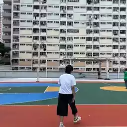 We'll need to climb to the top floor of the parking garage, where there's a basketball court. The basketball court itself is vibrant, making it stand out in photos. The actual building isn't as vibrant in color, likely due to prolonged exposure to the sun and rain, and the ongoing construction.