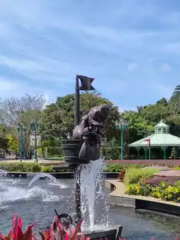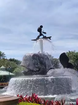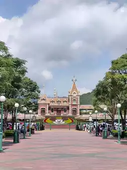The "Partners" Fountain 💦✨ is the cutest welcome spot at Hong Kong Disneyland, a must-see for anyone visiting. 📸 Above, the playful Mickey Mouse rides a skateboard 🐭🛹, spraying refreshing water all around. The surrounding area features a beautiful green garden 🌳🌼 for a relaxing stroll. The sparkling water adds a lively touch, perfect for couple photos or capturing beautiful moments for social media. 💕 Don't forget to walk around the fountain, admire its various angles, and you're guaranteed to take tons of adorable photos. 📷
