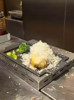 The clerk first puts the pre-fried burger steak on the iron plate, and we can cook the burger steak according to our preferred level of rawness. The hamburger steak is Juicy, lots of juice, really good with rice.