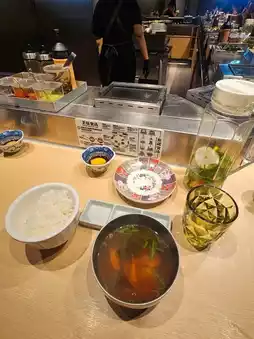 I ordered a three-piece burger steak meal. The burger steak is made with Japanese Wagyu and American beef, and is divided into three main flavors. The set includes white rice, broccoli and tomato and mussel soup are all you can eat, and there is also a raw egg to mix with rice.