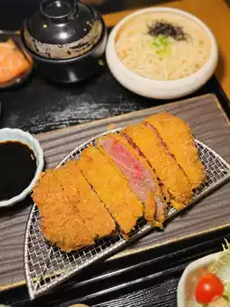 Wagyu lovers must try! The freshly fried Gillette Wagyu 🐮🔥, the outer layer is crispy to the point of "clicking"✨, cut into pink A4 Wagyu. The set includes main course, appetizer, sashimi, salad 🥗, tea bowl steamed rice, soup 🥣 and dessert 🍮, rich enough.
