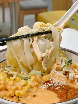 The shredded chicken is tender and paired with a special spicy sesame sauce 🌶️ and Thousand Island dressing, creating a sweet and spicy flavor with rich layers. The cold knife-cut noodles are chewy 🍜 and flavorful, complemented by refreshing cucumber shreds 🥒 and corn kernels 🌽 for added texture and a delightful appetizer. The generous portion is perfect for sharing.
