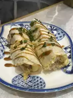 Taiwan's most popular cheese taro and pork floss omelet has become quite popular in Hong Kong in recent years. The omelet crust is chewy, and the taro and pork floss filling is the perfect savory and sweet combination.