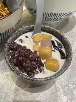 Finally, we opted for dessert. The three-color taro balls come in taro, sweet potato, and purple sweet potato, all very chewy. The grass jelly is soft and smooth, and paired with the evaporated milk base, it's incredibly satisfying.