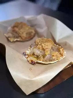 Fresh and plump scallops grilled to perfection, served with creamy mashed potato noodles for an exceptional layered taste.