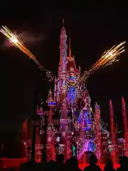 As the show begins, all eyes are on the castle, illuminated by dazzling lights. Disney characters appear through projections on the castle walls, accompanied by heart-pounding music—from Mickey Mouse to Elsa—every character comes to life.