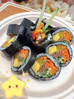 If you like to eat Korean seaweed rice, you must eat beef seaweed rice. The ingredients are fresh and rich 😛 There are also melted Korean egg rice and Korean waffles