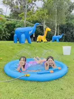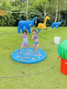 This is a super photogenic lawn park, with beautiful rainbows and adorable animals. From coconut trees to watermelons, you can run after the spray, shoot them with water guns, and jump into the pool. It's a blast! Don't worry, there's a hot tub for a shower afterward :)