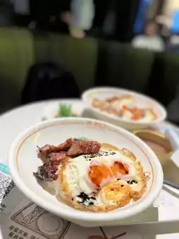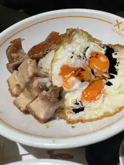 That is char siu rice, char siu thinly sliced, really done with holes in the edge, moderate fat and lean, beautiful meat, great with rice. Added three eggs. It looks attractive. Bonus points.