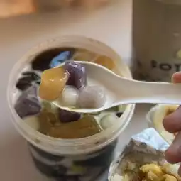 Fern cake has yellow bean powder and matcha flavors as well as small balls and taro balls, smoky and tough, and small balls, with elixir base, low-sugar soy milk and not too sweet, very rich, plenty of portions, share with others!