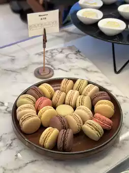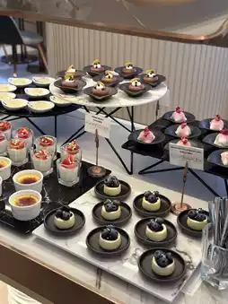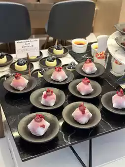 The dessert section is beautifully presented with a wide variety of options: macarons, bread pudding, crème brûlée, strawberry yogurt panna cotta, blueberry cheesecake, raspberry chocolate mochi, dark chocolate mousse, yuzu jelly, and more! Each piece is small, allowing you to try all the options, and their petite size makes them even more exquisite and appealing.