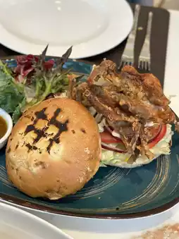 This giant soft shell crab burger is generously portioned, featuring two crispy soft shell crabs atop the bun. The bread is lightly toasted for a slightly crunchy texture, and paired with onions, tomatoes, and lettuce, it’s a flavorful delight.