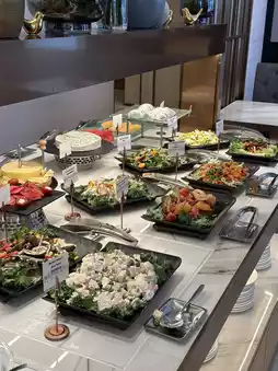 The salad bar offers a variety of options, including cold-cut platters, cheese platters, fruits, and diverse salad choices: Korean Kimchi Chicken Salad, Superfood Salad, Thai Beef Salad, Caesar Salad, Tomato Buffalo Cheese Salad, and more—eight flavors in total!
