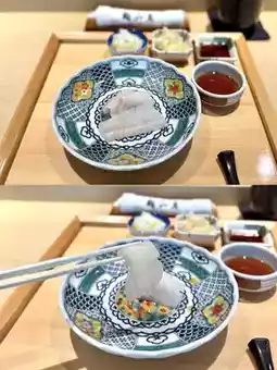 - Ark shell sashimi with Japanese cucumber, okra, and water shield (refreshingly sweet and fresh)