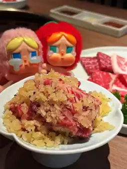 Contains thinly sliced shoulder meat, beef fillet, bare body and wagyu frosted meat, each piece of meat is quite fresh, grilled on the outside and tender inside 😌, full of taste. Especially the wagyu frosted meat, the oil is evenly distributed, melts in your mouth, it is really intoxicating🤤.