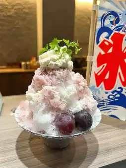 ➋ The shaved ice, shaved by the chef on the spot, is incredibly fluffy, and there are various flavors to choose from. My friend and I chose the grape flavor, which came with a side dish of sweet grapes 🍇