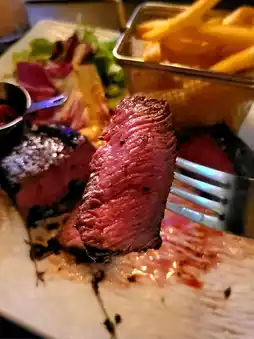 Flat Iron Steak 💜 The meat is tender and juicy, softer than the entrance of the sealed fillet, cut is a beautiful pink color, the steak with a smoky oil aroma, can not stop eating. The french fries are crispy on the outside and soft on the inside. They are delicious!