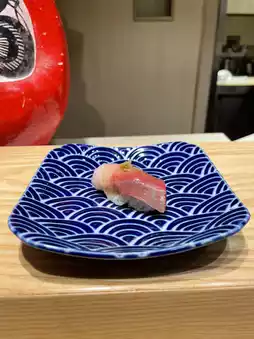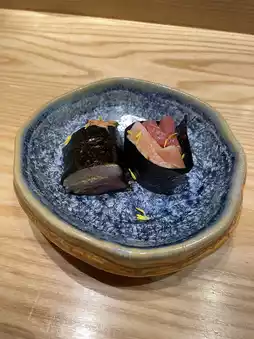 Naked sandwiched between medium and large toro, soft and smooth with an oily aroma, basil leaves and mustard reduce the oil of the toro.