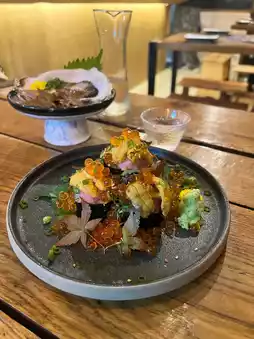 This sushi roll is generously crammed with toro paste, sea urchin, and salmon roe. 😻 A thick roll fills your mouth with a sweet, fresh flavor. 🫦👍🏻