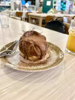 The photo is beautiful, the waffles are crispy on the outside and soft on the inside, plus chocolate ice cream and crumbled almonds, both adults and children love.