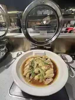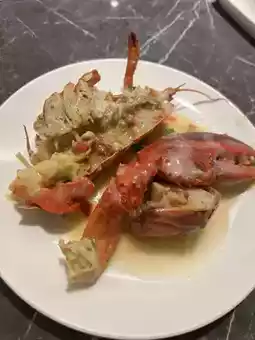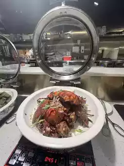 The Boston lobster poached in cream, butter, and white wine in the hot food section is a must-try. The lobster meat absorbs the aroma of the white wine and butter, resulting in a rich yet non-greasy texture. Chinese seafood dishes like black pepper crab meat and steamed shrimp with sticky rice in a bamboo basket with Hua Diao sauce are also standouts.