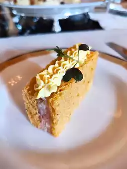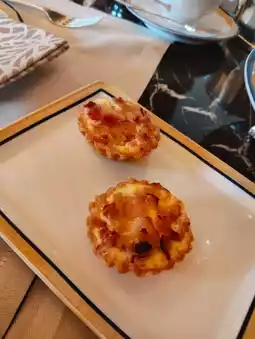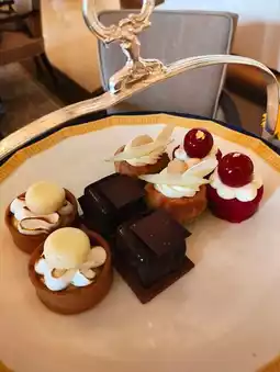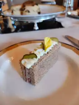 The savory items include a variety of finger sandwiches, such as 🐟 smoked salmon with horseradish cream open sandwich, salami and Swiss cheese 🧀 sandwich, 🦐 prawn and egg salad sandwich, and 🥒 traditional cucumber sandwich. The smoked salmon open sandwiches were the best, while the others were relatively ordinary. Additionally, there was a 🥓 bacon and cheese quiche, which honestly had a cheap appearance and taste.